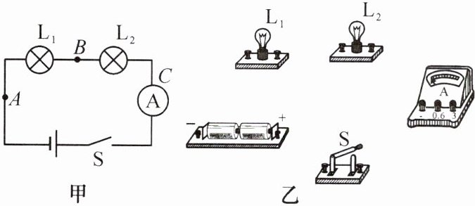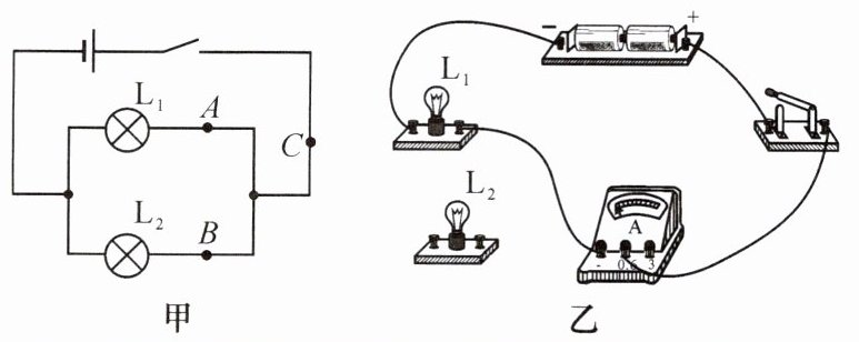 (1) 请根据图甲中的电路图,用笔画线代替导线将图乙中的电路连接完整,使电流表测量通过小灯泡$L_{1}$的电流。连接电路时应