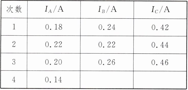 开关。(2) 用电流表分别测量$A$、$B$、$C$三点的电流,更换灯泡多次测量,将实验数据记录在表格中,其中第$4$次实验中$B$点的电流如图丙所示,则$I_{B}=$