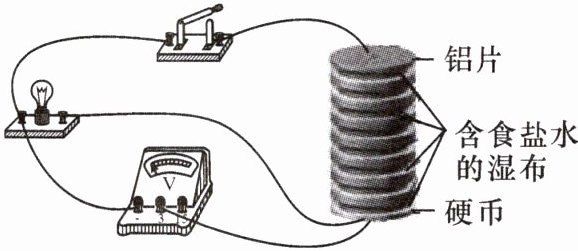 10. 小明将铝片和硬币依次堆叠,用浸有食盐水的湿布置于金属片之间自制“伏打电堆”并连接了如图所示电路。闭合开关,小灯泡发光,电压表指针右偏,下列说法正确的是(