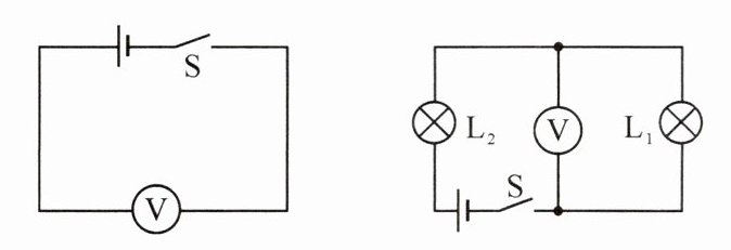 【例】在横线上写出下列电路图中,开关闭合后电压表的测量对象。(填“电源电压”“L₁两端的电压”或“L₂两端的电压”)