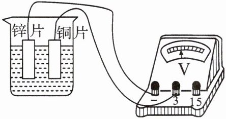 5. 如图所示,在烧杯中加入盐水,将铜片和锌片放在盐水中,组成一个自制电池。用电压表测量这个自制电池的电压,则