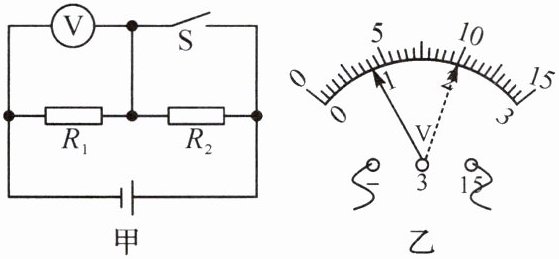 4. (2024·开封期中)如图甲所示的电路中,开关S断开时,电压表指针偏转如图乙实线指针所示;开关S闭合时,电压表指针偏转如图乙虚线指针所示:则电源电压为