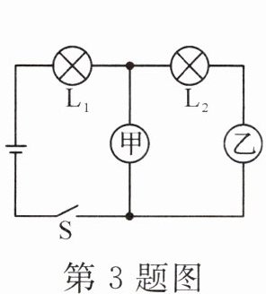3. 如图所示,当开关S闭合后,要使两只灯泡L₁和L₂均发光,甲表是