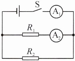 13. (2024·重庆 B 卷)将阻值为 $ 10 \Omega $ 的电阻 $ R_1 $ 与另一电阻 $ R_2 $ 接入电路,如图所示。闭合开关 $ S $,电流表 $ A_1 $ 的示数为 $ 0.45 \mathrm{A} $,电流表 $ A_2 $ 的示数为 $ 0.3 \mathrm{A} $。求:
