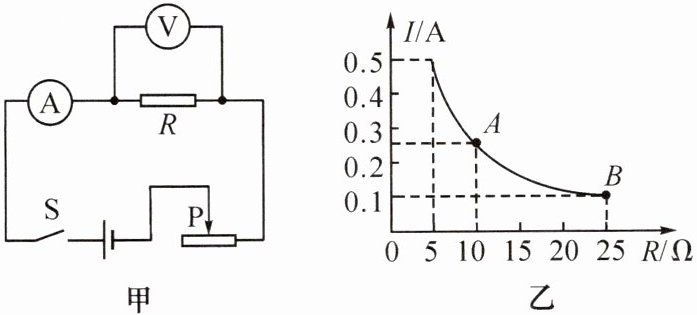 11. 【教材习题改编】在“探究电流与电阻的关系”实验中,电路如图甲所示,图乙是根据实验数据画出的 $ I-R $ 图像。由图像可知,电压表示数始终保持