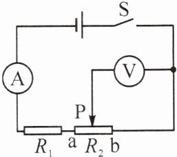 12. 如图所示,滑动变阻器$R_{2}$的最大阻值与定值电阻$R_{1}$相等。闭合开关$S$,当滑片$P$在$a$端时,电压表示数为$2\ V$,则电源电压为