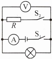 11. (2024·郑州八中期末)如图所示电路,电源电压保持不变,电阻$R$的阻值为$20\ \Omega$,小灯泡上标有“$6\ V\ \ 0.5\ A$”的字样。闭合开关$S_{1}$,电压表示数为$6\ V$。若再闭合开关$S_{2}$,则(