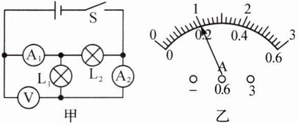 6. (2024·郑州金水区期末)如图甲所示电路,闭合开关 $ S $,两个电流表的指针指在同一位置,如图乙所示。则通过灯 $ L_{1} $ 的电流 $ I_{1}$=