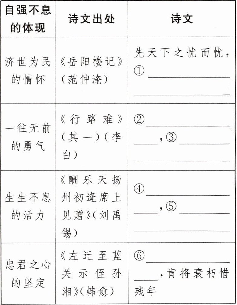 2. 古诗文中有很多体现自强不息精神的名句,把空缺的古诗文原句书写在横线上。