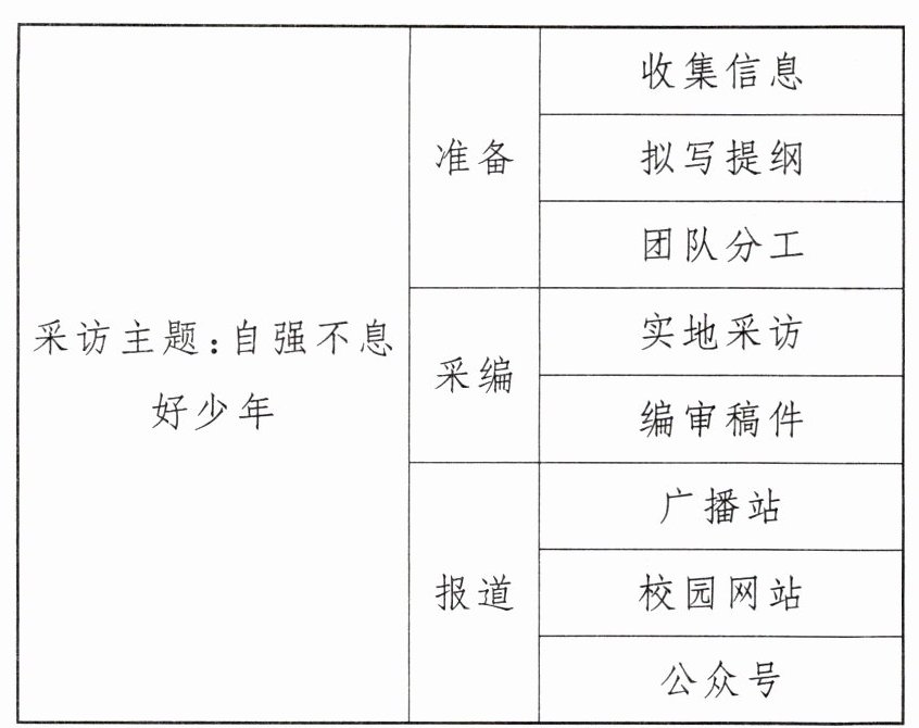 【示本次采访活动以“自强不息好少年”为主题,分为准采编和报道三个阶段。在准备阶段,要收集采访对信息,拟定采访提纲,做好团队分工;在采编阶段,先行实地采访,再编审稿件;最后通过广播站、校园网和公众号进行报道。