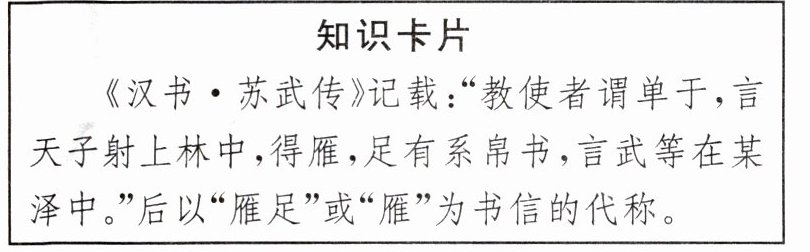 根据知识卡片的内容可知,相传大雁可以传递书信,以慰相思,所以意象“雁”往往和思乡之情联系在一起;