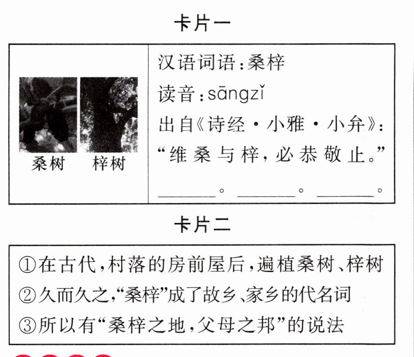 2. 下面是小南搜集的资料卡片。卡片一中对“桑梓”为什么会成为“故乡”的代名词的阐述有文字缺失。卡片二为其做了补充解释,使卡片一信息更完整。请你重新排列卡片二中句子的顺序,将序号依次填在卡片一的横线上,使该段文字语意连贯。
