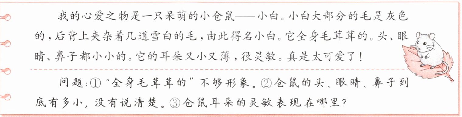 4. 示例:像一个松软的绒球 像两粒小黑豆一般大小 小得几乎看不见 即使极轻的脚步声也会令它竖起耳朵 解析 仔细阅读提出的"问题",然后根据提示,用恰当的语言把仓鼠的特点描述具体。