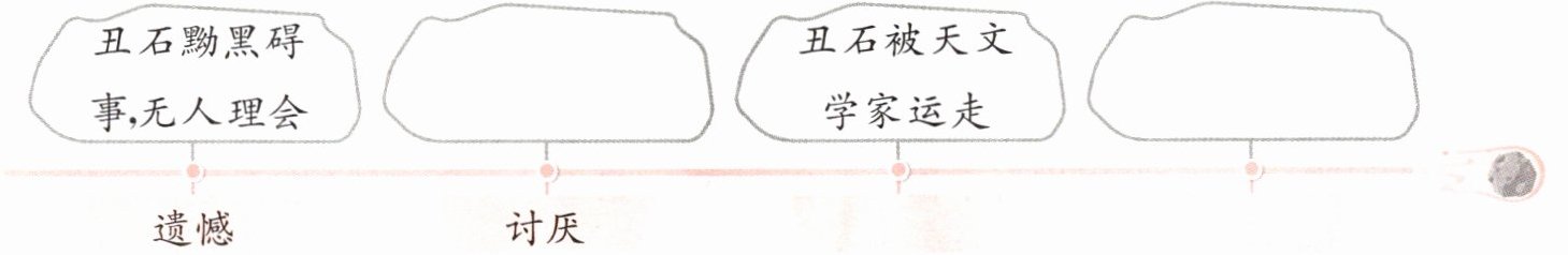 解析 本题考查梳理文章内容和作者感情变化的能力。第二自然段中,“它不像汉白玉那样细腻……”写出了丑石没有用,“花儿也不再在……”写出了丑石身边不长花,由“我们这些做孩子的,也讨厌起它来”可以知道此时“我”的感情是“讨厌”。第四自然段中,丑石被天文学家运走后,“我”感慨“这又怪又丑的石头,原来是天上的呢”,流露出的感情是“惊奇”。最后一个自然段中,“我又立即深深地感到它那种不屈于误解、寂寞的生存的伟大”,体现了“我”对丑石“不屈于误解、寂寞的生存”的伟大之处的赞美。