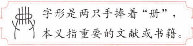 字形是两只手捧着“册”,本义指重要的文献或书籍。