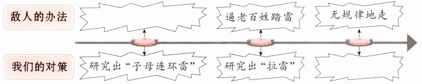 ①狡猾的敌人吃过几次苦头后,便想出了一些对付地雷的办法。他们遇到了"踏雷",就用石灰粉在其周围撒个圈,以防接触;遇到了"绊雷",就远远地用铁钩子钩出来。为了对付敌人钩雷,我们又研究出"子母连环雷",敌人起出母雷,子雷跟着爆炸。敌人逼老百姓在前面踏雷,我们就研究出"拉雷",等前面的群众过去后,再拉响地雷,专炸鬼子的大队人马;敌人无规律地走,我们就实施"飞行爆炸"。