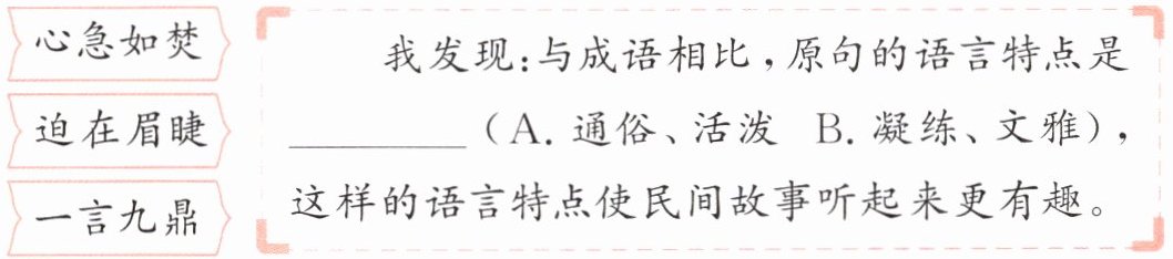(A. 通俗、活泼 B. 凝练、文雅),这样的语言特点使民间故事听起来更有趣。(2)感受民间故事的传奇色彩。