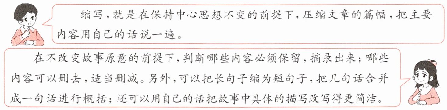 1 方法组的同学介绍了缩写故事的方法,请你阅读对话内容,完成练习。