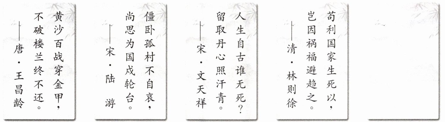 (1)请选择你搜集的爱国诗句,照样子书写在第五幅图中。