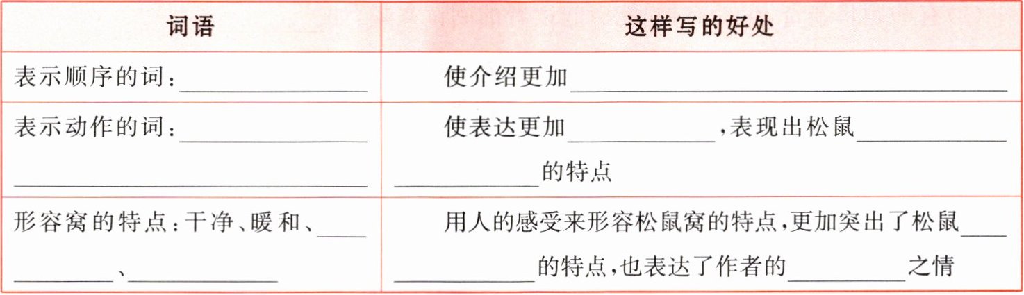 4 皓皓和琪琪都介绍了松鼠的窝,但介绍方法不同,谁的更好呢?请帮他们分析,完成练习。