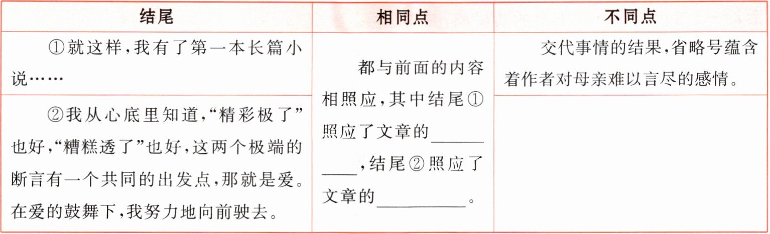 1 联系课文内容,体会结尾的特点,补全下面的表格。