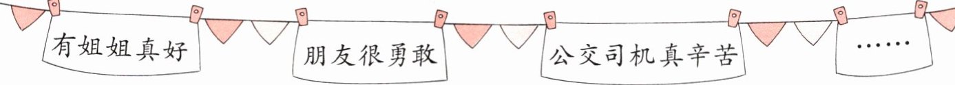 (2)示例:(有姐姐真好)有一天,妈妈没在家,我饿坏了。姐姐做了我最爱吃的蛋炒饭,我吃得可饱了!那一天,我第一次觉得有姐姐真好!我第一次觉得姐姐真厉害!
