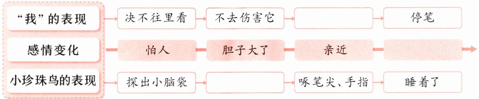 4 梳理课文内容,体会珍珠鸟由怕人到依赖人的感情变化过程,补全思维导图。