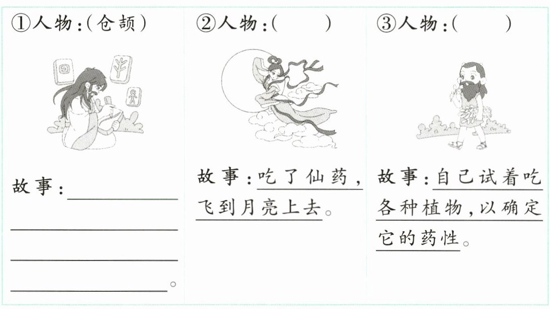故事:______ 故事:吃了仙药,飞到月亮上去。 故事:自己试着吃各种植物,以确定它的药性。