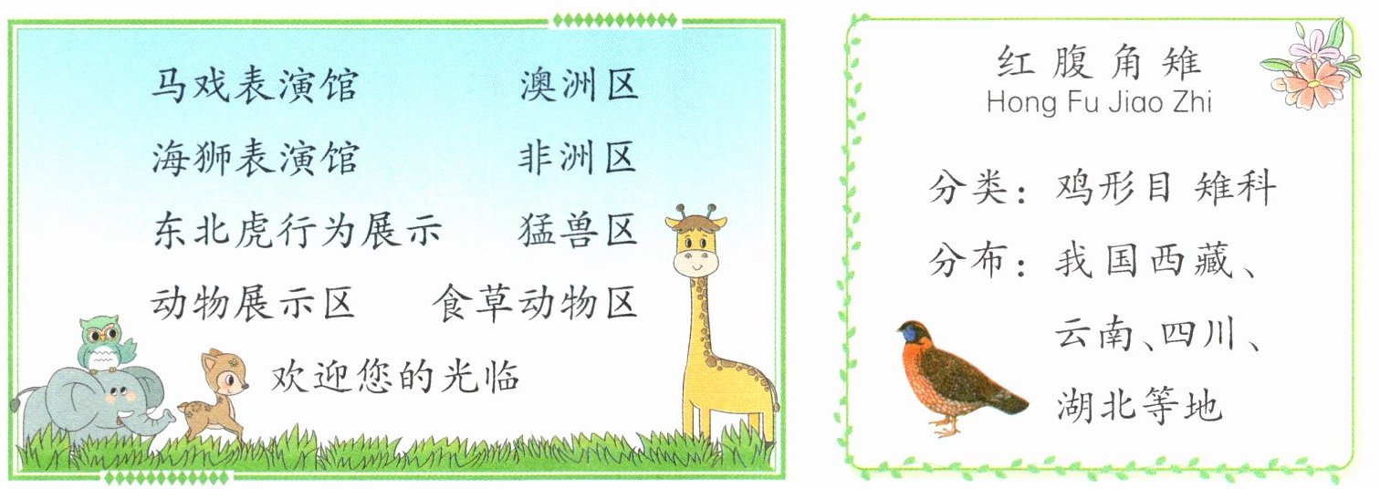 任务一:11 任务二:A 任务三:(示例)可以在展览牌上写与猛兽区有关的宣传语,画狮子、老虎、豹子等动物的卡通形象。 任务四:1. 鸟 2. 示例:① 从指示牌上认字;② 从各种说明中认字。