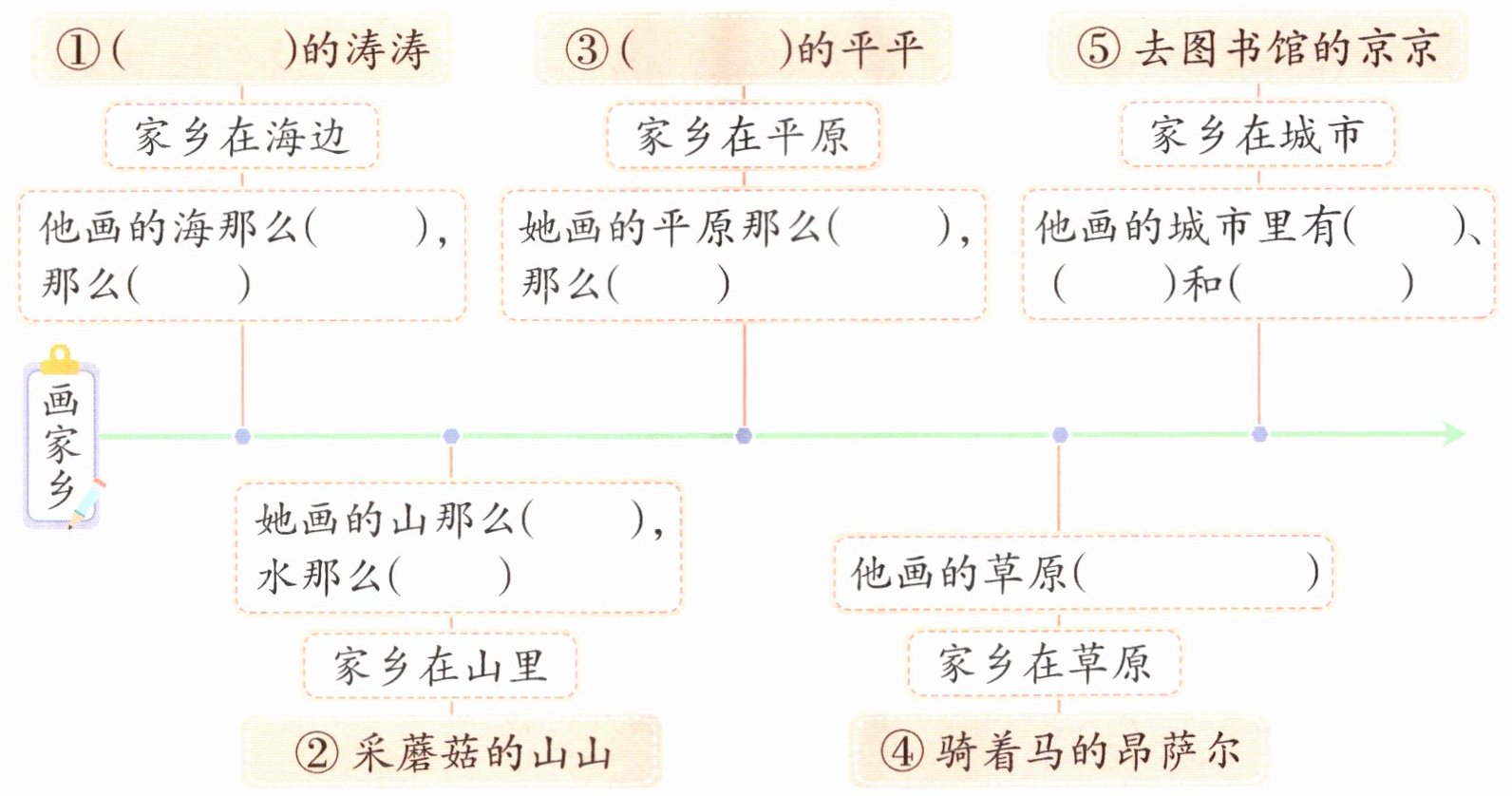 ① 捡贝壳 蓝 宽 ② 高 清 ③ 奔跑 平坦 宽广 ④ 一眼望 不到边 ⑤ 街道 楼房 街心 公园