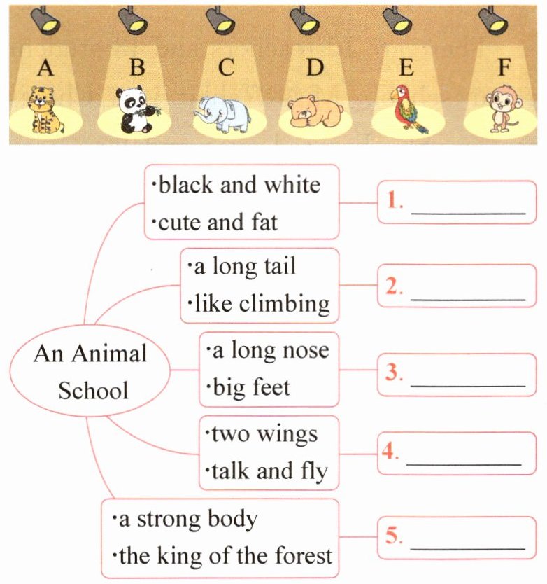 二、亮亮向大家介绍自己的动物学校里有哪些动物。根据亮亮的描述选择合适的图片补全思维导图。(有一项多余)