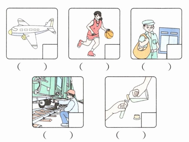 四、按短文描述顺序给图片排序,将数字写在方框内并给图片匹配相应的职业,将字母序号写在括号内。