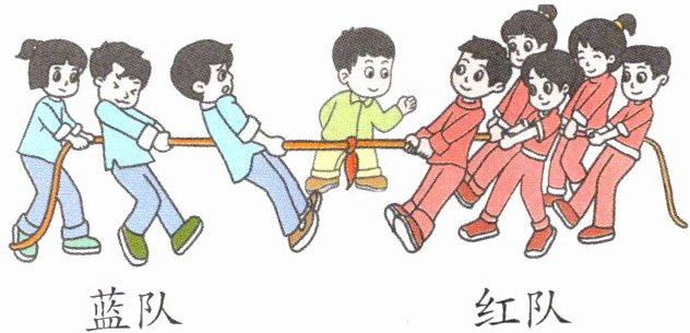 如图,两队小朋友正在拔河,要想使比赛公平,可以从红队调(1 2 3)人到蓝队,这样每队都有(3 4 5)人。(圈一圈)