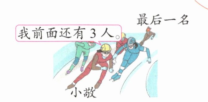2. 新情境 短道速滑 短道速滑是一种冰上竞速运动项目,需要运动员以最快的速度滑完规定的距离。如图,小敬的后面有( )人,此时她排在第( )名。一共有( )名运动员参加比赛。