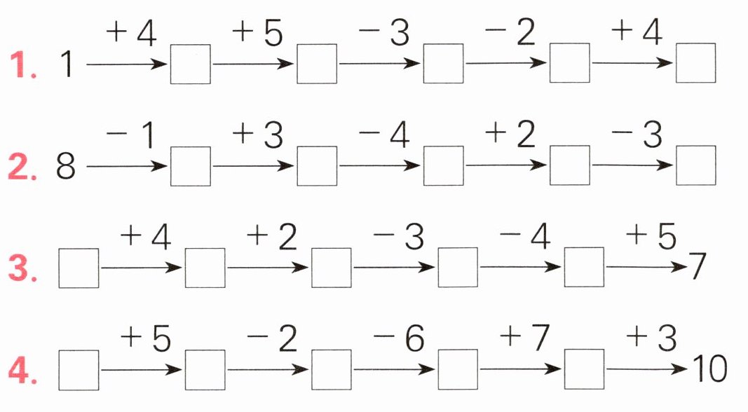 1. $1\xrightarrow{+4}□\xrightarrow{+5}□\xrightarrow{-3}□\xrightarrow{-2}□\xrightarrow{+4}□$