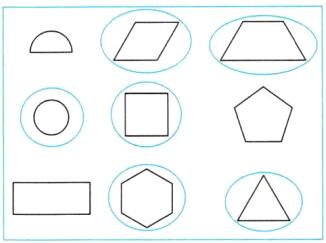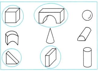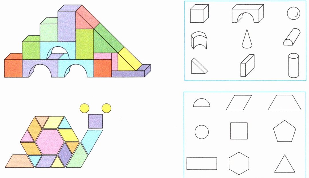 1. 乐乐用积木搭了一个滑滑梯,图图用卡纸拼了一只蜗牛,他们各用了哪些形状?圈一圈。