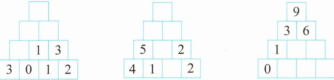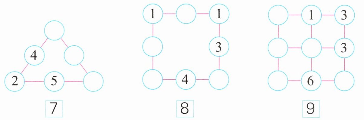 五、在○里填合适的数,使每条线上三个数相加都等于□里的数。(每空1分,共12分)