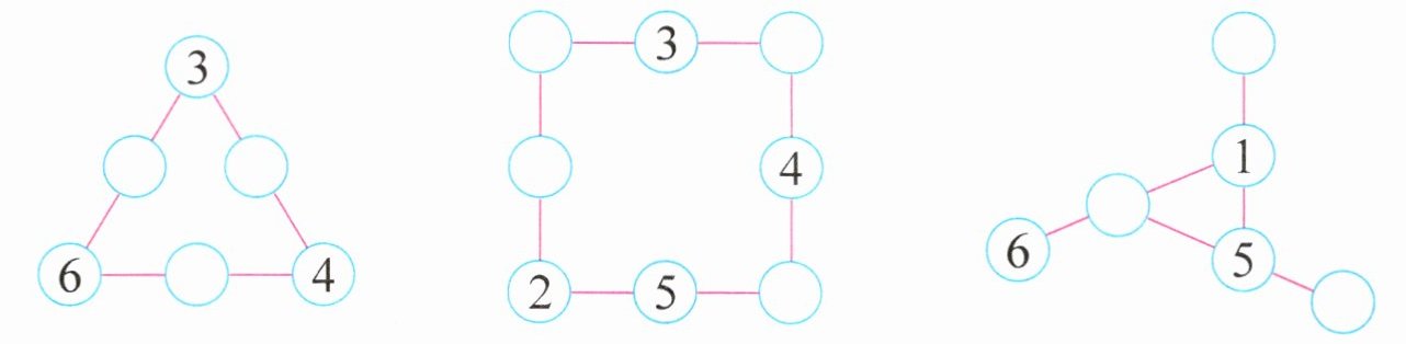 六、在○里填合适的数,使每条线上三个数相加都等于10。(每空1分,共10分)