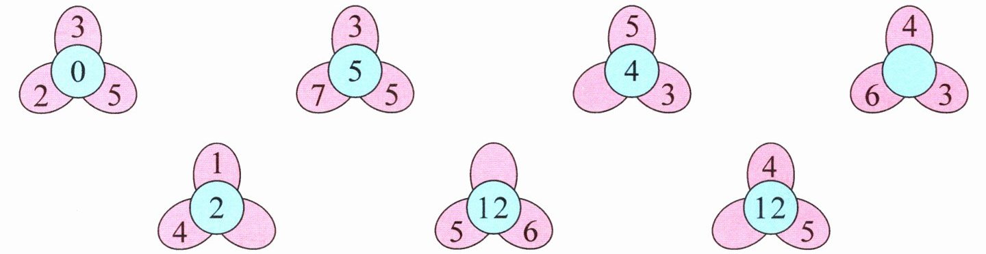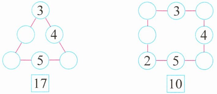 六、在$◯$里填合适的数,使每条线上三个数相加的得数都等于$□$里的数。(每空1分,共7分)
