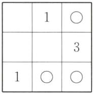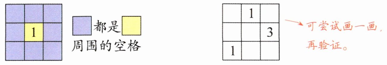 3. 新素养 推理意识 趣味“扫雷”。数字表示它周围的空格里有几个(每个空格里最多有1个)。例如“1”表示周围的空格里有1个,如下面左图。下面右图的“雷区”中,空格里可能有,请根据格子里的数字,找出的位置。(画○表示)
