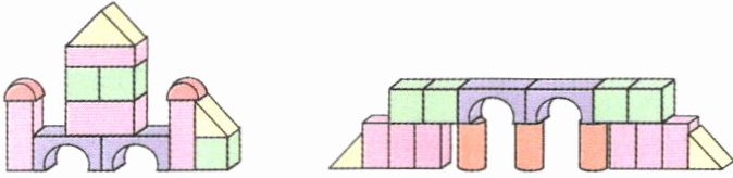 1. 新情境 七彩拼图 在班级“七彩拼图”活动中,明明用积木堆了一座城堡和一座小桥,请你仔细观察。(圈一圈,填一填)