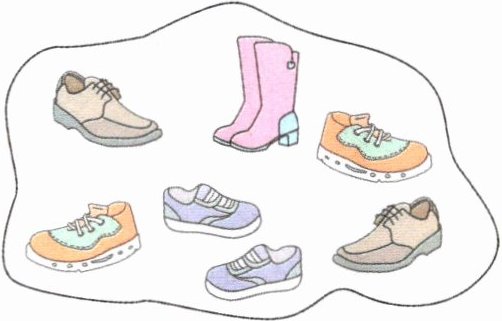 1. 新情境 客人来了 果果家里来客人了,如图是客人们的鞋子,她家里来了几位客人? 在正确答案后面的□里画“√”。