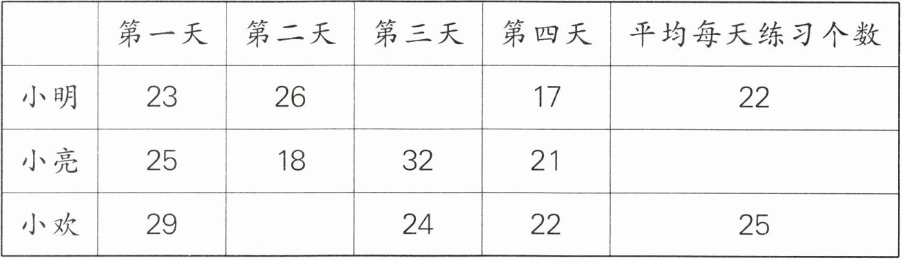 六、三个小朋友每天练习毛笔字的个数如下表,填写表格。(共 6 分)