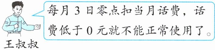 2. 新情境 话费充值 2025年3月末,王叔叔在手机话费还有32元的情况下参与了“充400元送100元”的话费充值活动。他使用的是每月38元的套餐,且每月不产生其他费用。王叔叔最晚应在哪一天再充一次话费?