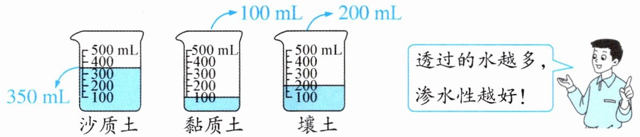沙质土的渗水性最好。沙质土透过的水有 350 mL,黏质土透过的水有100 mL,壤土透过的水有200 mL,350>200>100,因此沙质土的渗水性最好。