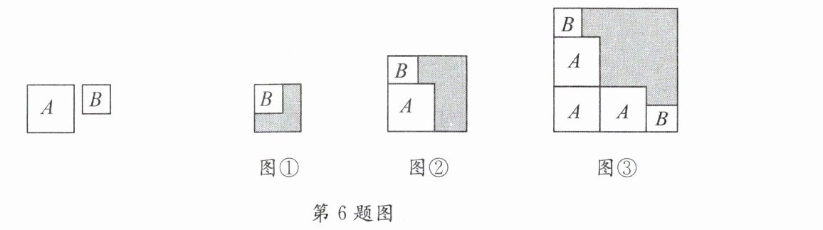 6. 如图,有两张正方形纸片$A和B$,图①将$B放置在A$内部,测得阴影部分面积为2;图②将正方形$A和正方形B$并列放置后构造新正方形,测得阴影部分面积为6.若将3个正方形$A$和2个正方形$B$并列放置后构造新正方形如图③(图②、图③中正方形$A$,$B$纸片均无重叠部分),则图③阴影部分面积为 (
