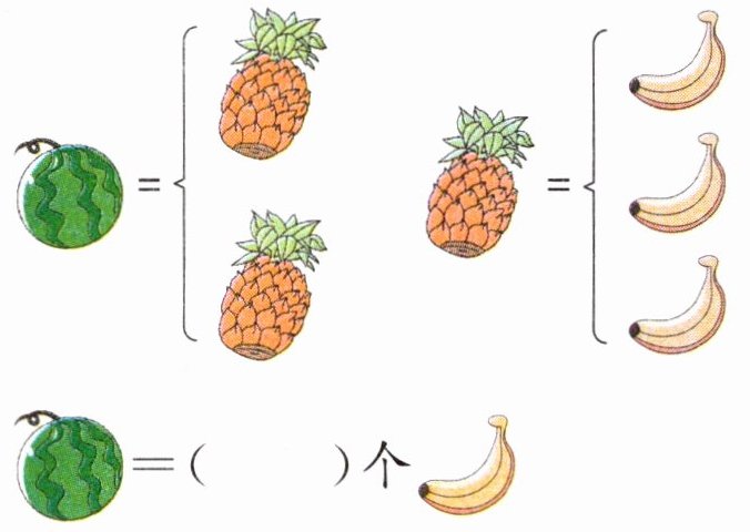 思路解析:1个菠萝代表3根香蕉,2个菠萝就是2个3,2×3=6(根),2个菠萝代表6根香蕉,所以1个西瓜代表6根香蕉。