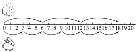 3×6=18 6×3=18 解析:两只小兔子开始的位置是相同的。观察题图发现,黄色小兔一次能跳6格,要跳3次才能吃到胡萝卜。它3次能跳3个6格,在图上从6开始跨2个6格画到18,用乘法算式表示是6×3=18或3×6=18。灰色小兔要跳6次才能跳到胡萝卜的位置