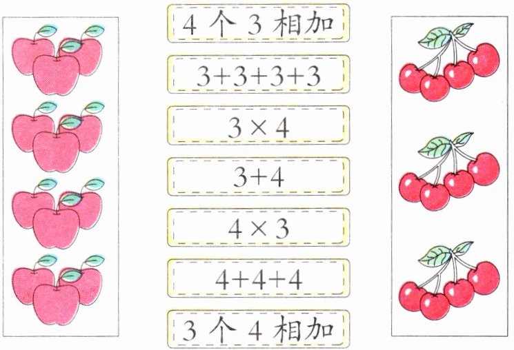 解题归纳:4个3相加或3个4相加,都可以用乘法算式3×4或4×3 表示。