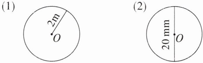 (2)圆的半径是2 cm,它的周长是3.14×2×2=12.56(cm)。它的面积是3.14×2²=12.56(cm²)。得出的数值虽然相等,但单位名称不同,表示意义不同,无法比较大小。